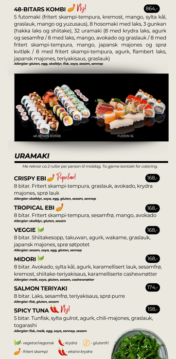 Dykk ned i vårt varierte utvalg av ferske sushi og asiatiske småretter, tilberedt med lidenskap og presisjon. Hver rett er en feiring av rene råvarer og utsøkt smak. Vi inviterer deg til å utforske menyen og finne din favoritt.